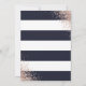 Modern blue and rose gold 30th birthday party invitation featuring party details inside a rose gold frame against a blue and white striped background adorned with rose gold confetti. Easily personalise this template to any birthday party.