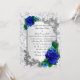Pretty blue roses and silver leaf pattern frame. This beautiful wedding invitation is a modern and elegant way to invite family and friends to your wedding. Personalise the card by changing the text in the fields provided front and back. You can change font style, size, and colour, as well as paper type and style.
