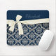 Elegant Blue Silver Damask Diamond Bow Monogrammed Mouse Pad
