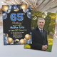 An elegant modern design featuring blue 65 number with gold edges and balloons with silver, blue and gold glitter and a special photo of the birthday person on the back of the invitation. Customize the details for a unique and chic Birthday Celebration.
