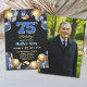 An elegant modern design featuring blue 75 number with gold edges and balloons with silver, blue and gold glitter and a special photo of the birthday person on the back of the invitation. Customize the details for a unique and chic Birthday Celebration.