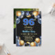 An elegant modern design featuring blue 96 number with gold edges and balloons with silver, blue and gold glitter and a special photo of the birthday person on the back of the invitation. Customize the details for a unique and chic Birthday Celebration.