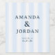 These elegant wedding wine labels feature a minimalist design with vertical blue stripes in light sky and slightly darker shades, creating a subtle yet sophisticated pattern. The layout is centered and symmetrical, highlighting the names "Amanda & Jordan" in classic serif typography that exudes timeless charm. Customizable text fields allow for personalization with location and date details, making these labels perfect for adding a personalized touch to your celebration. The overall mood is refined and understated, ideal for formal occasions where simplicity meets elegance.