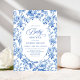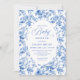 Create a timeless first impression with this baby shower invitation featuring elegant French toile de jouy roses in refined shades of navy blue, royal blue, dusty blue, and deep blue, inspired by classic chinoiserie floral design. This sophisticated style blends heritage elegance with modern charm, making it perfect for a memorable baby shower celebration.