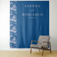 This is a minimalist style image featuring an elegant wedding invitation with a deep blue background. The left side showcases a charming white floral pattern, adding a touch of sophistication and romance. The names "Lauren and Benjamin" are prominently displayed in a classic serif font, followed by the date "May 23, 2026," all set against the serene blue backdrop. It exudes a sense of timeless elegance and refinement, perfect for setting the tone for a sophisticated celebration.