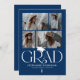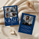 Announce your graduate’s milestone in timeless, sophisticated style with this elegant blue and white graduation announcement card. Featuring a trendy blue background, the design highlights the word “GRAD” in a modern serif typeface, accented with a stylish graduation cap icon above the “R.” The flowing tail of the “R” transitions into a sleek tassel that connects the graduate’s name, school, and class year, creating a cohesive and high-end finish.