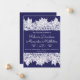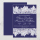 Elegant blue white wedding announcement. Your details are accented by top and bottom borders of line drawn Dianthus, Lily of the Valley, foliage and Lady Bugs. Cards reverse to a deep royal blue.
