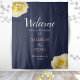 Elegant Blue Yellow Roses Floral Wedding Welcome Tapestry. This elegant floral wedding welcome tapestry features beautiful yellow roses in two corners and fancy white and peach colour typography on a dark navy blue background. Personalise all the text on the tapestry, bride`s and groom`s names and the wedding date.