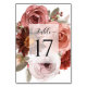 Elegant floral table number card with exquisite hand painted watercolor bouquet. Use of elegant and graceful modern Calligraphy. Flowers and foliage in a combination of blush pink, rose gold, peach, burgundy, Marsala and sage green tones. Part of our "Heaven in Rose" wedding and events collections.