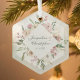 Elegant blush pink watercolor peony flower Christmas ornament with grey script within the gorgeous floral diamond of sage green eucalyptus leaves and pretty peonies. Beautiful personalised floral wedding gift with a couple's names and date for a lovely keepsake.