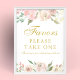 An elegant floral poster for wedding favours decorated with beautiful blush pink roses and peonies. A lovely sign for a spring or summer garden wedding ceremony written in chic antique gold script. Please take one.