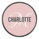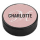 Modern monogrammed puck with a black name and a white script monogram on a blush pink background. Personalise with name and initial.