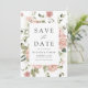 Elegant floral save the date cards featuring your names, wedding date, and location framed by a border of watercolor roses in shades of blush pink and dusty rose with lush green foliage. The romantic rose wedding save the date cards are perfect for your upcoming spring and summer garden weddings!