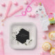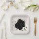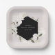 Elegant Bohemian Floral Bridal Shower paper plates. White watercolor flowers and delicate green foliage black geometric frame.