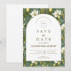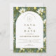 A sophisticated botanical design featuring rich green foliage and soft ivory blooms, framed within a timeless arched layout. The deep, nature-inspired tones bring a sense of depth and refinement, while the clean typography keeps the overall look elevated and effortless.