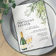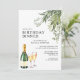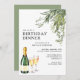Modern birthday dinner invitations featuring a watercolor illustration of a celebratory champagne bottle with two filled drink glasses. Text is fully editable. The reverse side is a coordinating sage green colour.