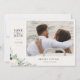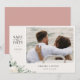 Elegant watercolor botanical foliage and white floral arrangement, save the date photo card. Features, neutral cream and dusty rose colour backgrounds with calligraphy "the" accent graphic.
