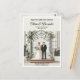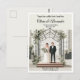 Elegant wedding postcard featuring a modern botanical garden theme with an illustration of a couple standing under a stylish conservatory arch. Surrounded by lush greenery and a classic greenhouse backdrop, this design is perfect for botanical garden, greenhouse, or spring weddings. A budget-friendly invitation option that is fully customizable for your special day.