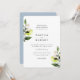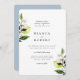 Elegant botanical lemon branches and floral blossom arrangements, wedding invitation. Modern and simple typography design style template. Back of card features coordinating solid light dusted airy blue colour.