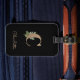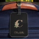 Elegant black luggage tag with a gold botanical monogram in the centre.