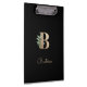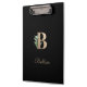 Elegant black clipboard features a gold botanical monogram in the centre.