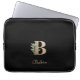 Elegant black laptop sleeve features a gold botanical monogram in the centre.