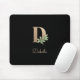 Elegant black mouse pad features a gold botanical monogram in the centre.
