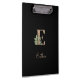 Elegant black clipboard features a gold botanical monogram in the centre.