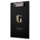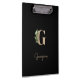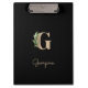 Elegant black clipboard features a gold botanical monogram in the centre.
