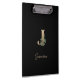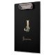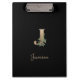 Elegant black clipboard features a gold botanical monogram in the centre.