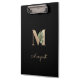Elegant black clipboard features a gold botanical monogram in the centre.