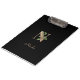 Elegant black clipboard features a gold botanical monogram in the centre.
