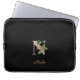 Elegant black laptop sleeve features a gold botanical monogram in the centre.