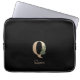 Elegant black laptop sleeve features a gold botanical monogram in the centre.