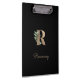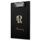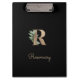 Elegant black clipboard features a gold botanical monogram in the centre.