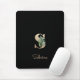 Elegant black mouse pad features a gold botanical monogram in the centre.