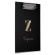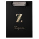 Elegant black clipboard features a gold botanical monogram in the centre.