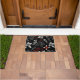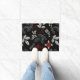 Elegant botanical pattern on black background featuring white leaves, red berries, and intricate floral designs in gold accents, creating a festive, decorative feel.