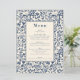 Elevate your wedding reception with this elegant botanical-themed menu, designed to complement a classic and timeless celebration. The sophisticated floral border in deep blue frames the central text, offering a graceful and refined presentation for your guests. With a cream-toned vintage-inspired background design brings a touch of old-world charm to your modern celebration. Perfect for adding an extra layer of beauty to your table setting, this menu guides your guests through the delicious courses planned for your big day. Ideal for couples seeking an elegant, traditional aesthetic for their wedding.