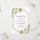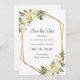 Elegant chic botanical Save The Date card features white vanilla romantic wedding roses with hints of blush pink of displayed in leafy greenery on a timeless white background. A sparkling golden colour geometric crystal-shaped frame provides a trendy touch. Personalise wedding details for your guests in elegant charcoal grey lettering and script. The back of the card is white. Feel free to contact me at invitationsuites@gmail.com if you have questions regarding this or any of our designs.