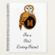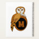 Cartoon of an elegant British barn owl is drawn from the side with the head looking over its shoulder. A monogram egg is nested under the bird wing. The M is short for monogram and can be personalised for your initial.