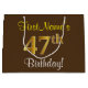 This simple, elegant birthday gift bag design features a personalised message like "FirstName’s 47th Birthday!" (with the "47th" having a faux/imitation gold-like colouring look) on a brown coloured background. The name is in script-like, yellow-coloured text, and can be customised. A personalised birthday gift bag like this could perhaps be used when giving a present or gift to somebody who is celebrating their forty seventh birthday. [~Z0000262]