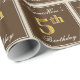 This simple and elegant wrapping paper design features a personalised message like "NameHere’s 5th Birthday" (with the "5th" having a faux/imitation gold-like colouring look) within a brown-coloured square area featuring a simple border outline. The name is in an elegant white-coloured script-like text, and can be personalised. Wrapping paper like this could perhaps be used when wrapping birthday gifts for somebody who is celebrating their fifth birthday. [~Z0000223]