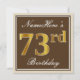 This simple and elegant birthday party invitation design features a personalised message like "NameHere’s 73rd Birthday" (with the "73rd" having a faux/imitation gold-like colouring look) within a brown-coloured square area featuring a simple border outline. The name is in an elegant white-coloured script-like text, and can be personalised. The back features personalised invitation details. A birthday party invitation like this could perhaps be used when inviting people to a birthday party being held for somebody who is celebrating their seventy third birthday. [~Z0000229]
