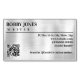 An elegant business card magnet featuring a faux brushed silver foil background, black text, and a QR code.