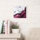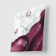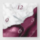 Elegant modern white marble and burgundy red agate trimmed with faux silver glitter combine in this luxurious square wall clock. The numbers 3 and 6 appear in light silver gray on the agate background, while the numbers 9 and 12 appear in dark burgundy on the white marble.