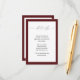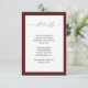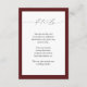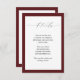 Modern and elegant, this wedding invitation details card design features delicate modern calligraphy and a burgundy red border. The front and back both contain text fields that you may personalise easily, to include accommodation information, directions, and other pertinent details about your wedding that aren't appropriate on the invitation itself. The back of the card features a bouquet of burgundy red and blush pink flowers. This details card coordinates with a matching wedding suite. View entire suite here: https://www.zazzle.com/collections/elegant_burgundy_blush_floral_watercolor_script-119122012303568319 Contact designer for matching products. Copyright Anastasia Surridge for Elegant Invites. All rights reserved.