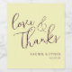 This elegant wedding wine label features a simple, balanced layout with a pale yellow background. The phrase "love & thanks" is written in a flowing cursive script, creating an intimate and affectionate tone, while the names and date are presented in clean serif and sans-serif fonts for clarity. The deep burgundy colour palette adds warmth and sophistication, making it perfect for celebrating special moments. The minimalist design focuses on typographic elements, ensuring readability and aesthetic appeal without any additional motifs or patterns. Ideal for personal acknowledgements or weddings, this label combines classic elegance with functional clarity.