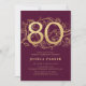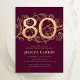 Elegant burgundy maroon gold 80th birthday party invitation. Customisable dark red marsala wine design featuring roses botanical accents and typography script font. Simple floral invite card perfect for a stylish female bday celebration. Personalise with your own details. Printed Zazzle invitations or instant download digital printable template.