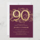 Elegant burgundy maroon gold 90th birthday party invitation. Customisable dark red marsala wine design featuring roses botanical accents and typography script font. Simple floral invite card perfect for a stylish female bday celebration. Personalise with your own details. Printed Zazzle invitations or instant download digital printable template.